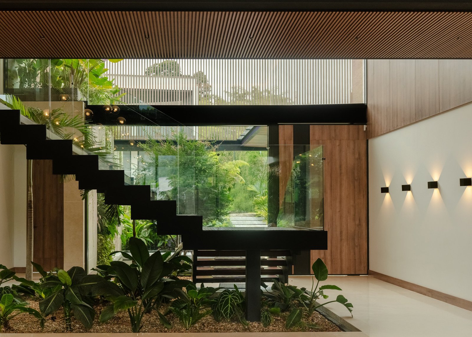 El interior es una celebración del espacio vertical. El vestíbulo de doble altura impacta con un muro texturizado en piedra que recorre la casa de abajo a arriba, sirviendo como columna vertebral visual. El elemento protagonista es, sin duda, la circulación: un puente interior con barandas de vidrio y piso de madera que conecta las habitaciones, generando una sensación de estar caminando en el aire y permitiendo una comunicación visual constante entre la planta baja social y la planta alta privada.